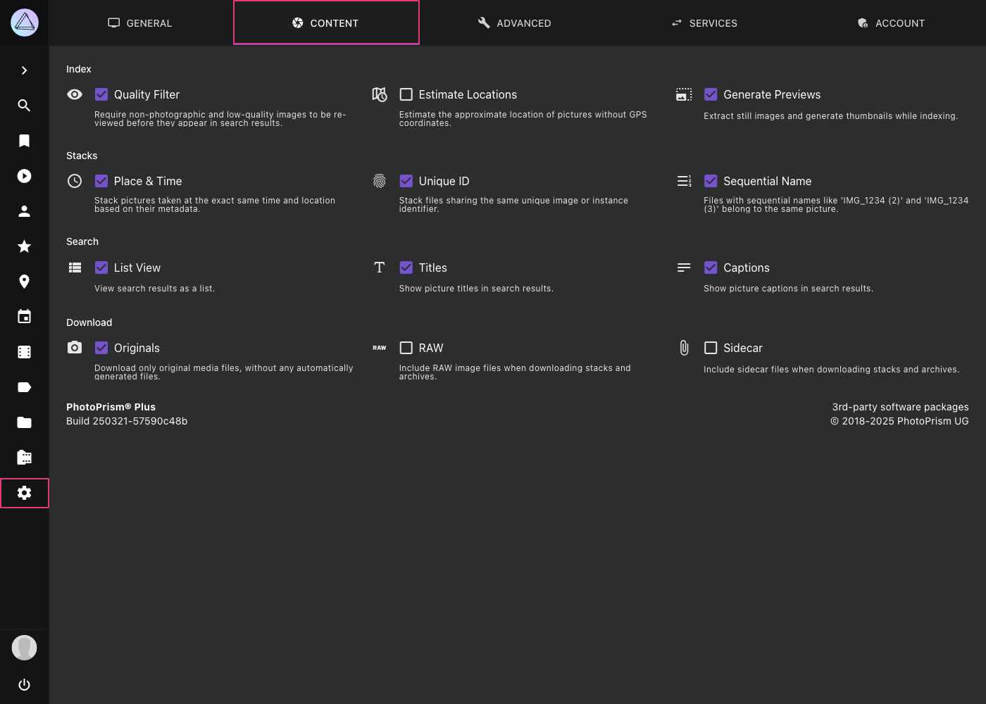 PhotoPrism offers you the following optional stacking methods, which you can choose to enable based on your personal preferences:
